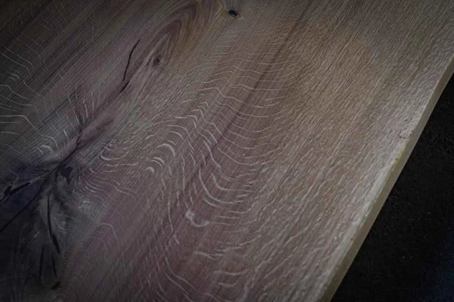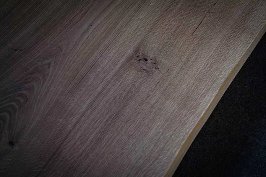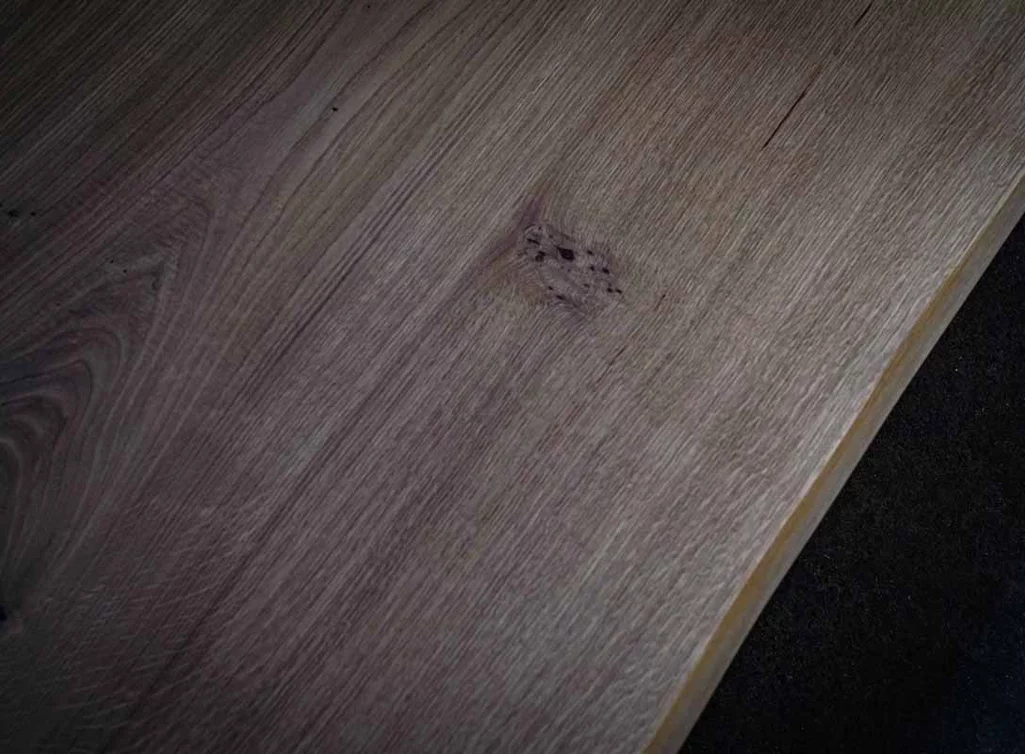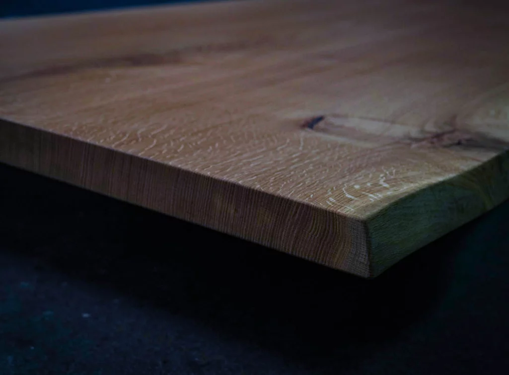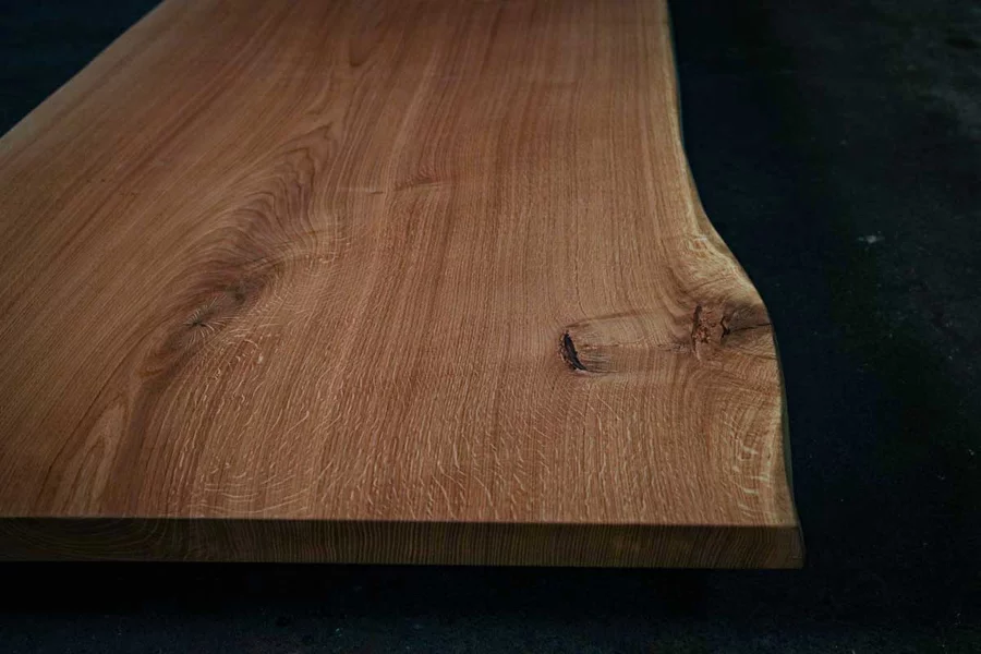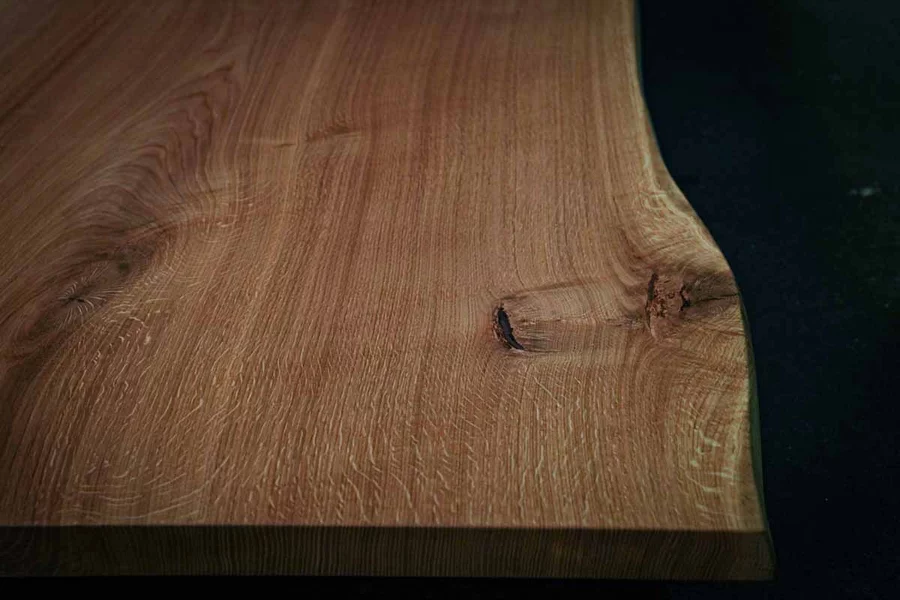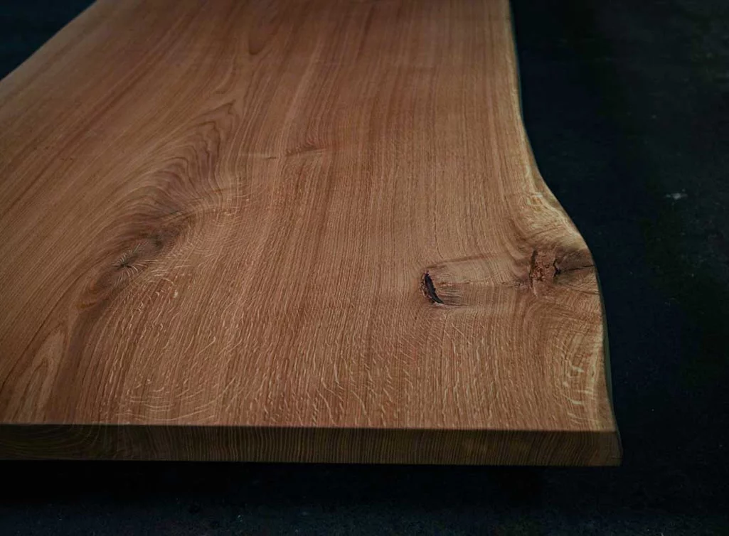 Diese massive Eichen-Baumscheibe lebt von ihrer unverwechselbaren Maserung und dem warmen Farbton der geölten Oberfläche. Die organische Form der Baumkante macht jedes Stück zum Unikat, während die dunkelbraun gefüllten Äste und Risse den rustikalen Charakter betonen.