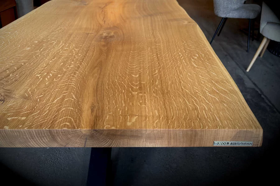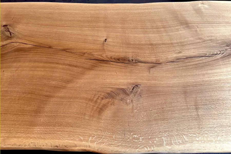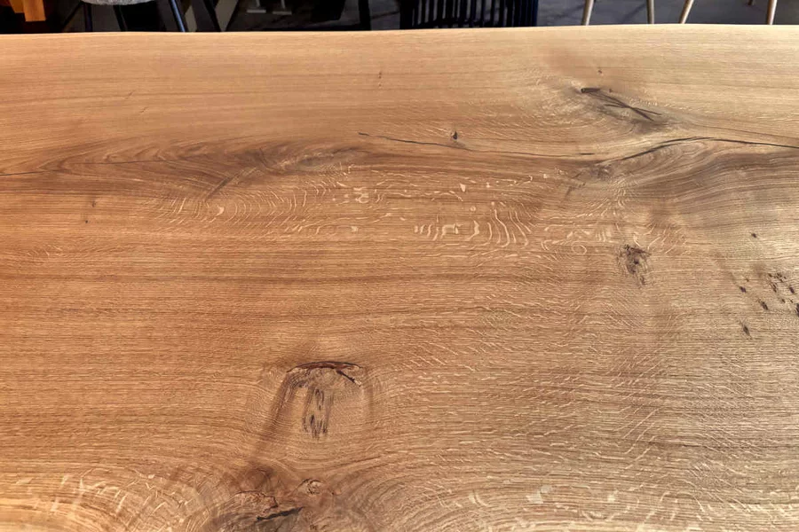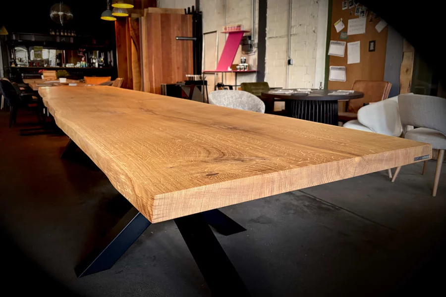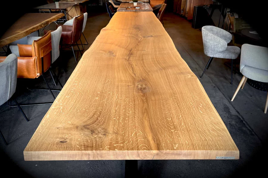 Diese Tischplatte ist ein echtes Statement: 470 cm lang, aus einem einzigen Stück massiver Eiche gefertigt – keine Leimfugen, keine Kompromisse. Die natürliche Baumkante macht jede Platte zum Unikat, während die deutlich sichtbaren Markstrahlen und Aststrukturen der Oberfläche eine kraftvolle, organische Optik verleihen.