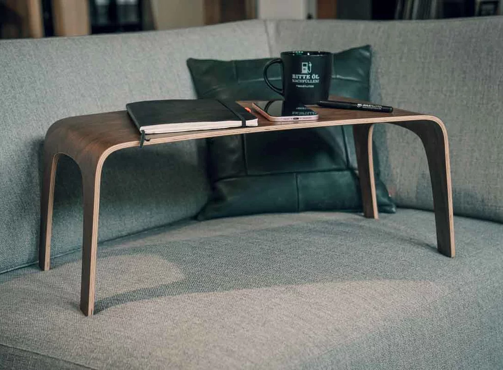 Die durchdachten Maße machen den Laptop Table perfekt für die Nutzung im Sitzen oder Liegen. Er bietet genug Platz für Laptop, Buch und Kaffeetasse – und passt dank seiner schlanken Form bequem über die Beine oder auf weiche Unterlagen.