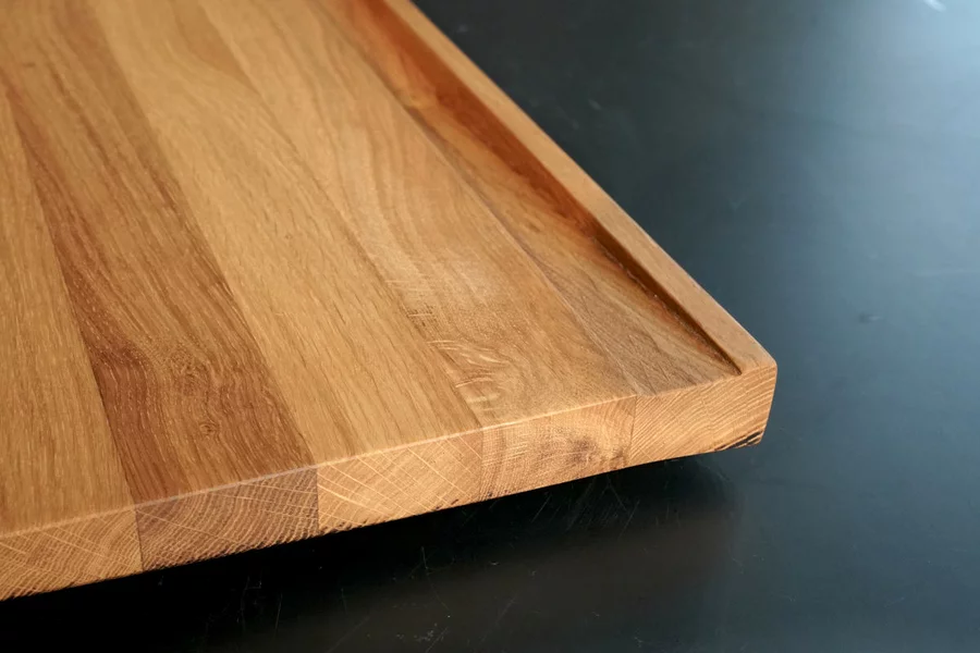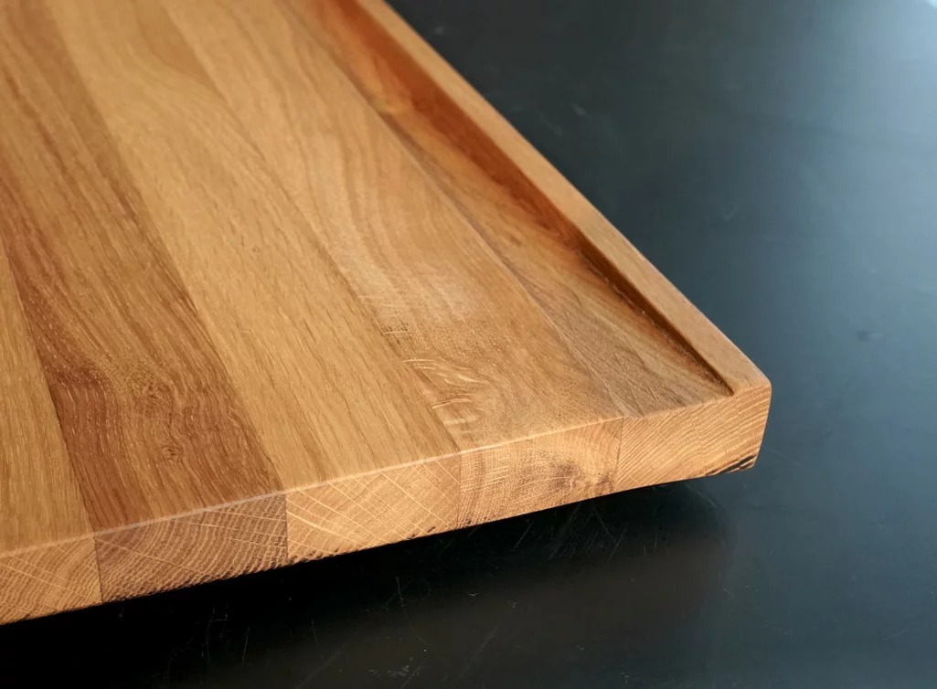 Eiche-Schneidebrett mit Saftrille & Gefälle. Maße 46 × 32 × 4 cm. Fleischsaft läuft sauber ab, massive Eiche, geölt & messerschonend.