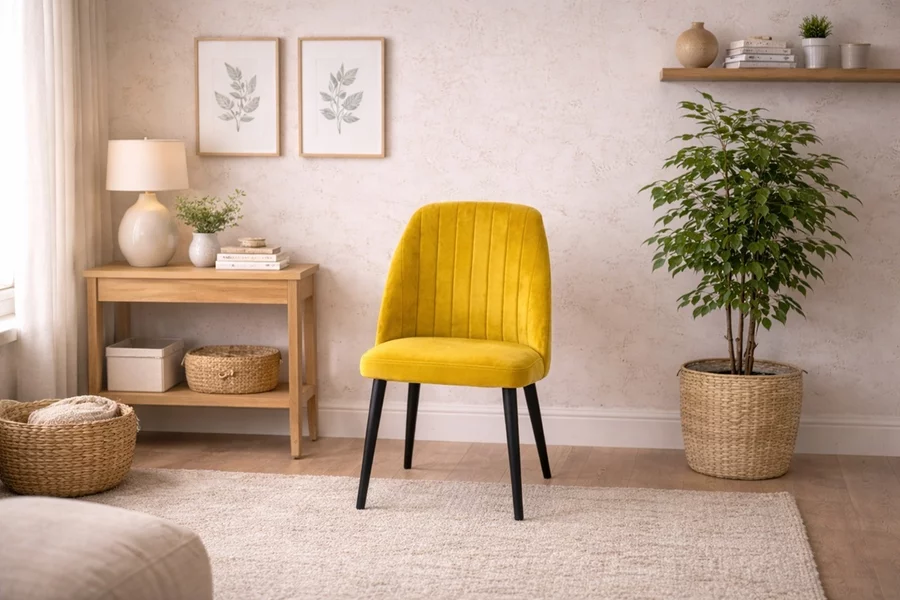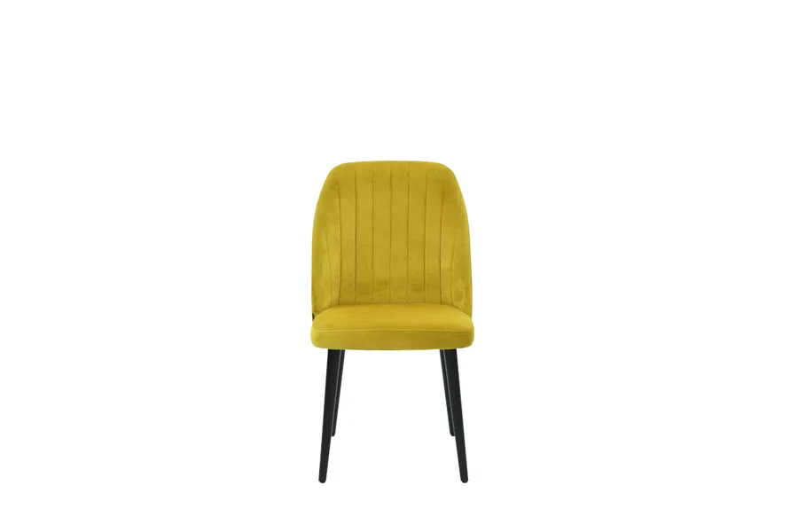 Stuhl 5B im Stil der 60er Jahre ohne Armlehne. Gepolsterte Sitzschale mit vertikaler Steppung und Holzbeinen – ideal für Esszimmer und moderne Wohnräume.